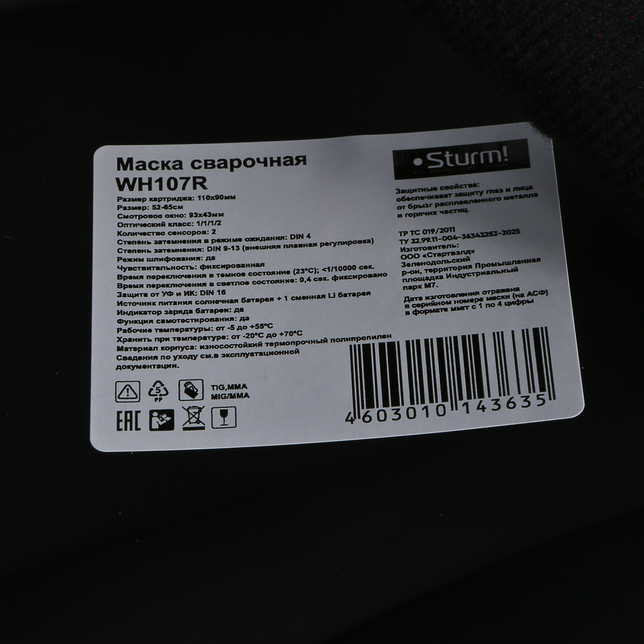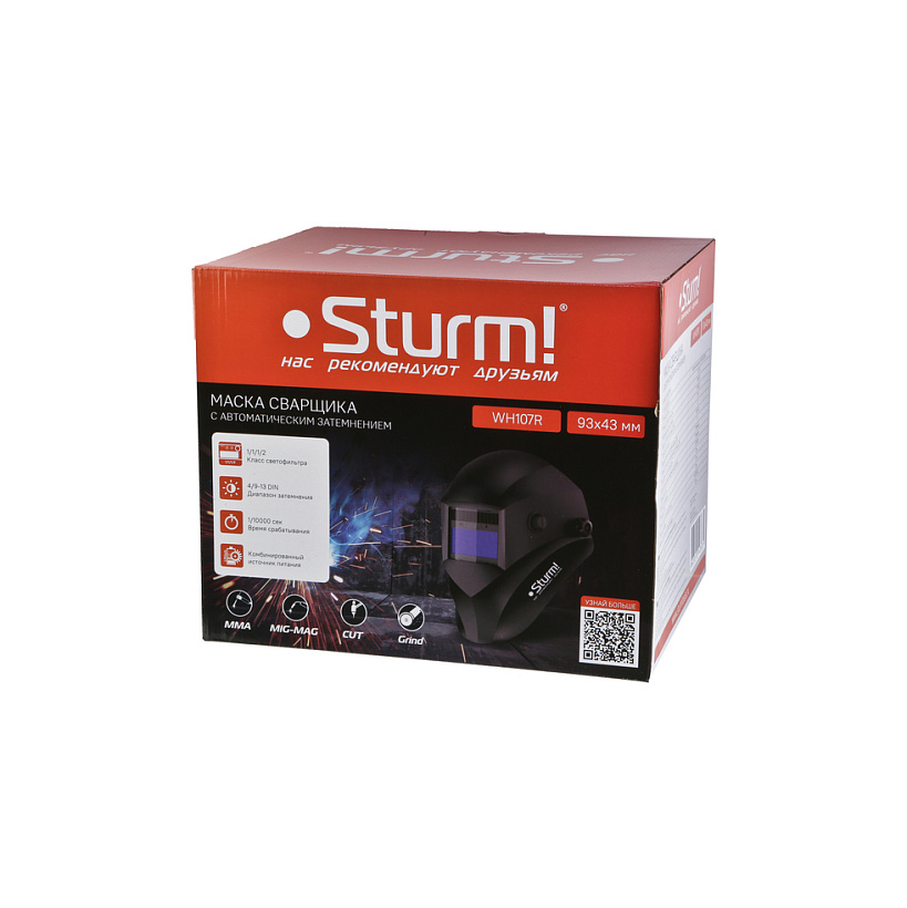 Маска сварщика Sturm! WH107R, оснащённая автоматическим светофильтром высокого качества с классом защиты 1/1/1/2, гарантирует максимальную защиту глаз и лица от ультрафиолетового излучения, инфракрасного света и ярких вспышек дуги при сварке в режимах MMA, MIG-MAG , Plasma.