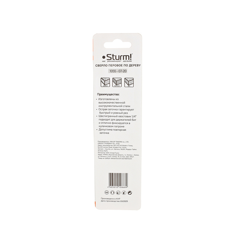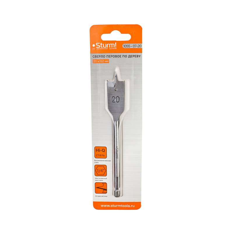 Сверло перовое по дереву, 20мм, шестигранный хвостовик, Sturm!