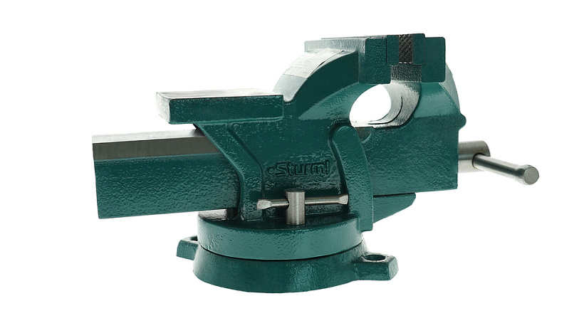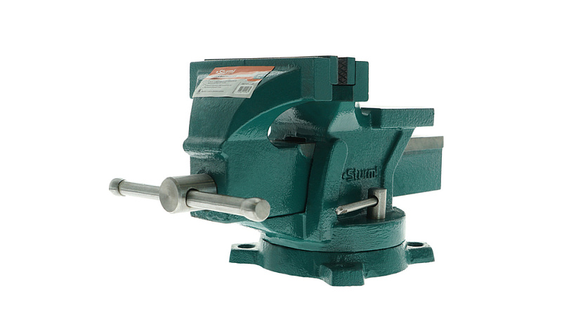 Поворотное основание позволяет бесступенчато изменять положение тисков относительно опоры, что обеспечивает удобство работы.