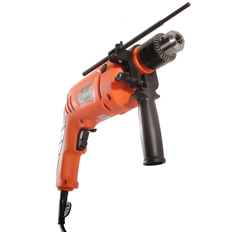СОЮЗ ДУС-2180 - односкоростная универсальная дрель для бытового применения. За счет хорошо продуманной эргономики, дрель максимально удобна в использовании: прорезиненные накладки основной рукояти и возможность установки дополнительной рукояти в любом угловом положении способствуют надежности хвата, размещенные непосредственно под пальцами, флажковый переключатель реверса и регулятор количества оборотов гарантируют простоту управления, исключая лишние движения. Предусмотрена фиксация клавиши пуска для удобства непрерывной работы. Модель оснащена производительным 800 Вт электромотором, развивающим скорость вращения на валу шпинделя до 3000 об / мин – достаточный запас по мощности способствует высокой эффективности сверления в материалах различной твердости. Наличие ударного механизма позволяет уверенное использование дрели при работе с твердыми, но хрупкими материалами (керамика, керамогранит), без риска их повреждения. При необходимости, для повышения производительности, режим удара можно задействовать при сверлении отверстий в кирпичной кладке и легком бетоне. Диаметр шейки корпуса под европейский стандарт - 43 мм – обеспечивает возможность установки дрели в сверлильную стойку.
