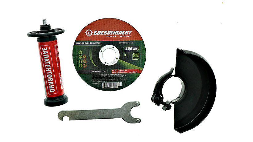 Гайки для крепления диска, комплект щеток, дополнительная рукоятка, ключ, защитный кожух в комплекте.