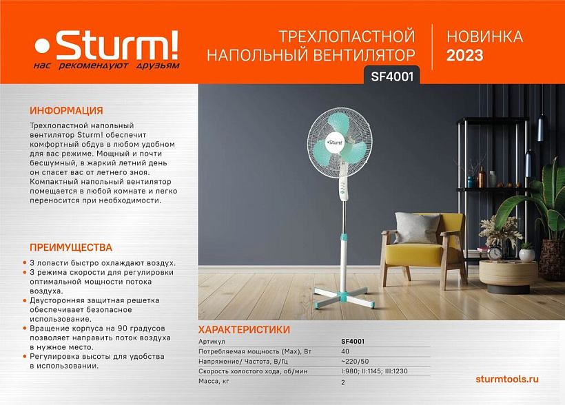Вентилятор Sturm! обеспечит комфортный обдув в любом удобном для вас режиме. Мощный и почти бесшумный, в жаркий летний день он спасет вас от летнего зноя. Компактный напольный вентилятор помещается в любой комнате и легко переносится при необходимости.