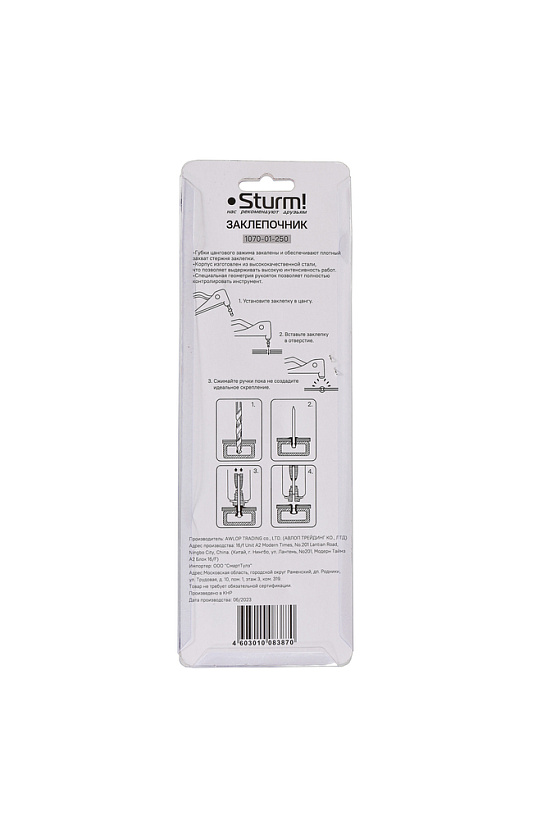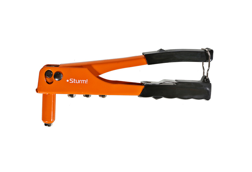Заклепочник Sturm! 1070-01-250 является универсальным инструментом для соединения деталей из листового металла, ткани, кожи и пластика. Он поставляется с подпружиненной ручкой, которая выталкивает стержень заклепок. Корпус ручного заклепочника изготовлен из стали с нескользящими рукоятками и ключом для замены насадок. Комплектация включает 4 типа сменных головок: 3/32" (2,4 мм), 1/8" (3,2 мм), 5/32" (4,0 мм) и 3/16" (4,8 мм).